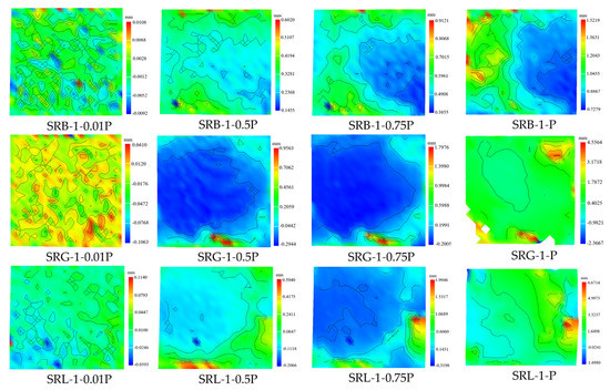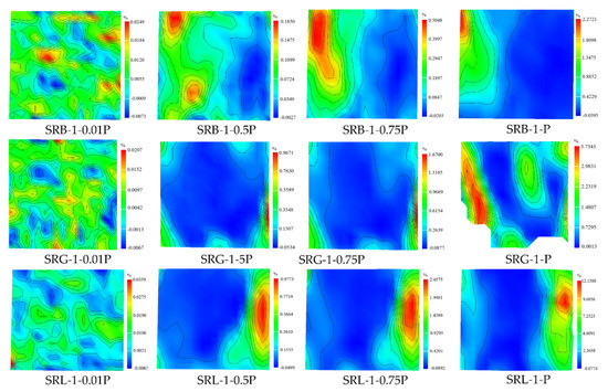 As shown in Figure 6, the Z-directional displacement cloud diagrams for specimens MRB-1, MRG-1, and MRL-1 corresponded to peak strengths of 1%, 50%, 75%, and 100%. At the beginning of loading, microcracks appeared and then expanded continuously, and the development met the aggregate. The main crack stopped expanding, and the branched cracks started developing around the aggregate. The interlocking force between the aggregate and mortar resisted the development of cracks, and the accumulated energy destroyed other weak surfaces in the adjacent area so that the cracks eventually moved around the aggregate and started to develop towards the upper part and the cement matrix. When the peak load reached Pmax, the values of Z-directional displacements of the surfaces of the three groups of mortar rubble, MRB-1, MRG-1 and MRL-1, were 1.55 mm, 4.52 mm and 6.67 mm, respectively. The Z-directional displacement of limestone was the largest, which indicated the weak interfacial linkage of limestone mortar rubble. The test results showed that the mortar rubble was characterized by nonuniform deformation during loading due to the different sizes of the large aggregates in each direction. Under uniaxial loading, cracks appeared to surround the aggregate aggregates and propagated in the matrix parallel to the loading direction. The principal strain and displacement fields under DIC detection can accurately predict the damage mode of the slurry schist. The displacement and strain cloud diagrams measured by DIC indicated that interfacial debonding was the dominant damage mode for mortar rubble structures. The magnitude of the interlocking strength of the aggregate and mortar was the key factor affecting the compressive strength of the mortar rubbles.