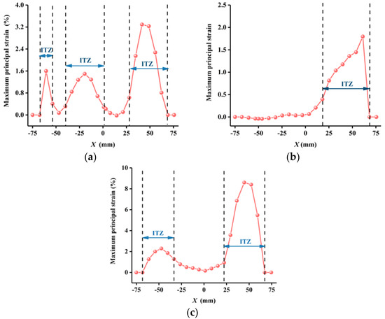 Maximum principal strain on the horizontal section. (a) SRB-1. (b) SRG-1. (c) SRL-1.
