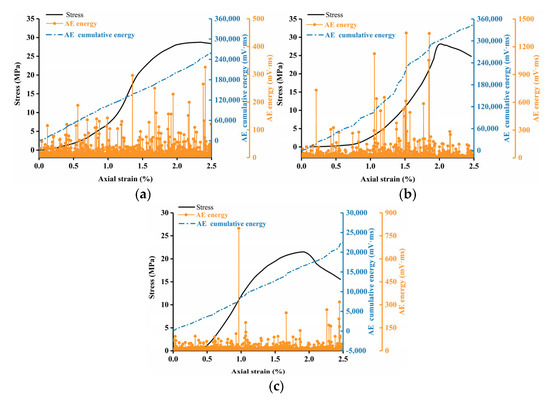 All the characteristic parameters of AE energy are related to the signal energy. These parameters reflect information about the energy released by crack formation and expansion under loading. Figure 8 shows the AE energy curves vs. stress development for the SRB-1, SRG-1, and SRL-1 groups. Figure 8a,b show that the AE signal patterns of the basalt and granite mortar rubble specimens were similar. In the initial stage of damage, which is microfracture pressure-dense closure, and the AE activity energy was generally low. After reaching the crack growth stage, the value of the AE energy surged, the cracking became active, and a large amount of damage appeared. A longer time was required to maintain a high energy level. The cumulative AE energy curve and the stress-strain curve showed similar trends. The highest instantaneous energy of the granite mortar rubble was 1349 mV·ms, which was 4.1 times greater than that of the basalt mortar rubble (326 mV·ms). As shown in Figure 8c, the limestone mortar rubble had only a single energy peak, the accumulated energy was much smaller than that of the other specimens, and the energy of resistance to damage was relatively small. The resistance to damage was very brief, and brittle fracture occurred instantaneously.