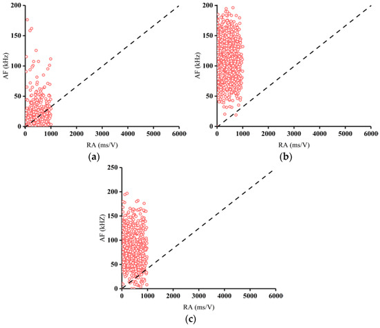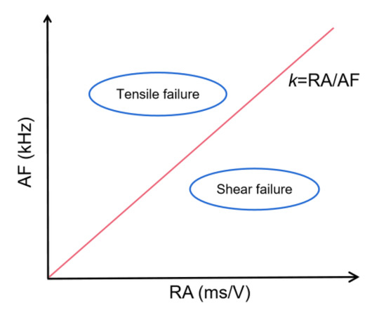 As mortar is a mixture of aggregate and mortar, its mode of damage under compression includes tensile damage and shear damage. The damage type of cracking can be evaluated based on the correlation between RA and AF in the AE characteristic parameters. RA is the ratio of rise time to amplitude. AF is defined as the ratio of ringing count to duration in kHz. The energy of a longitudinal wave released by the damage under tension is large, and the AE waveform has a short rise time and high frequency. The energy released by a transverse wave caused by damage under shear is large, and its AE waveform has a long rise time and low frequency. The ratio of RA and AF, k, is affected by the nature of the test material. According to the empirical value, the value of k was taken as 30. The damage mode discrimination criteria based on the RA-AF value of acoustic emission are shown in Figure 9.