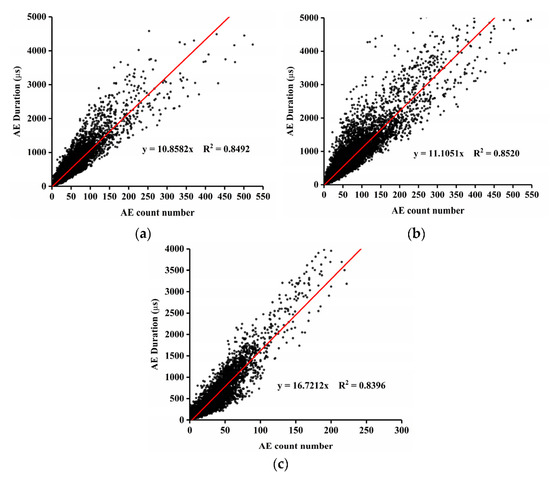 Figure 11 represents the relationship between AE duration and ringing count for the 1 SRB-1, SRG-1, and SRL-1 groups. As shown in Figure 11, there was a positive correlation between the AE duration and the ringing count, i.e., the ringing count increased with increasing duration. The equation for the correlation was established according to the linear relationship, the fitting effect was good, and the correlation coefficient R2 of the three equations was greater than 0.8. The largest correlation coefficient (R2 = 0.852) was obtained for the AE count-duration equation of the specimen of mortar rubble SRG-1. The fitting results indicated that the model had explained the behavior of the granite mortar rubbles to a significant extent.