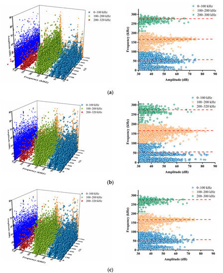The next step was to analyse the relationship between the frequency domain and amplitude of the AE signal segment by segment. The short-time Fourier transform (STFT) of the original waveform of the AE data in the uniaxial scaling test and the STFT expression of the AE signal f(t) are shown in Equation (6),