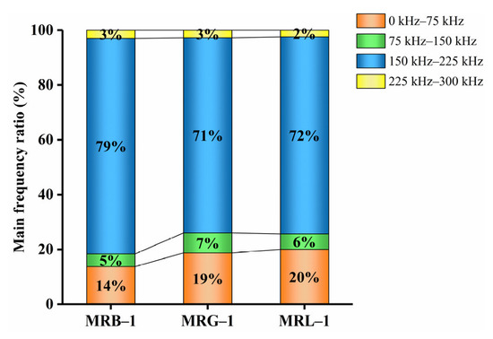During the crack growth phase, the frequency bands of the SRB-1, SRG-1, and SRL-1 groups were dominant, as shown in Figure 13. In the current stage, the frequency band measured by AE was dominated by signals from 150 kHz to 225 kHz. The maximum limit of the frequency that corresponded to interfacial debonding of mortar rubble was 225–300 kHz, and interfacial damage occurred at frequencies that exceeded 300 kHz. The signals in the frequency band of 150–225 kHz were more predominant in the basalt-aggregate specimens than in the other specimens. This meant that when basalt was used as an aggregate, the signal frequency in the dominant band before specimen damage was relatively high, and the low-frequency acoustic emission signal was relatively weak. This result most likely indicated that the basalt-mortar rubble microjoints developed more slowly, the interfacial bond was strong, and the probability of destabilization damage of the specimen was relatively low.