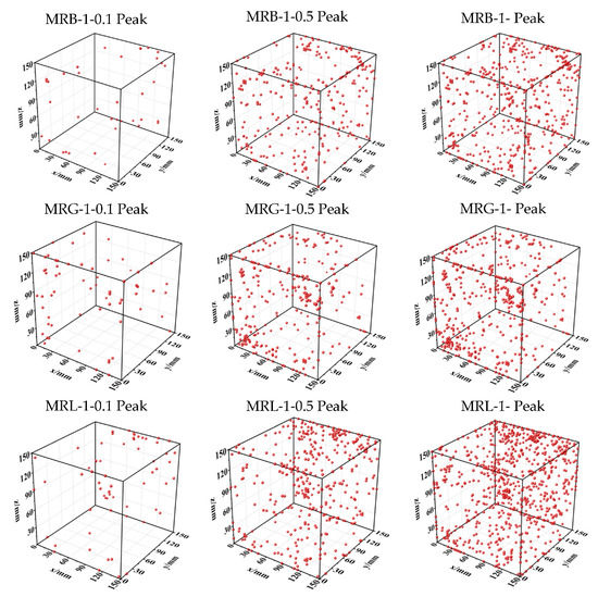 The evolution of the acoustic emission locations at different stress stages for the three mortar rubble loadings until damage is shown in Figure 14. In the initial loading stage, the AE events tended to occur close to the fracture location. The microfractures of all three mortar-rubble specimens started at the interface and then extended to the mortar region with increasing stresses. At lower loads, the difference in AE locations of the three specimens was large, especially the basalt aggregate specimens, which had less acoustic emission information, indicating that the fracture damage occurred relatively late. In the preloading period, the AE signals indicated the gradual tightening of the mortar aggregate interface. When the observed loading reached 50% Pmax, the AE events clustered near the macroscopic fracture zone of the mortar rubble, and many AE signals appeared at the aggregate mortar interface with coherent and dense emission signals. This behavior was consistent with that observed in Figure 5 and Figure 6. Upon reaching the peak load Pmax, AE signal cracks were observed to develop to full interface penetration, and they formed a clear damage zone along the loading direction. The results for the localization of the damage source under uniaxial loading revealed the mechanism of the development of interfacial cracks in the mortar rubble and the damage mechanism of the specimens. The overall analysis showed that overall, the AE events were distributed primarily at both ends.