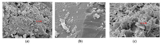 The SEM results for interfaces in mortar rubble made of three crushed aggregates, basalt, granite and limestone, are shown in Figure 15. The SEM magnification was 30,000 times. The high-resolution SEM images confirmed that the pore structure of the ITZ of mortar rubble differed according to aggregate type. Figure 15 shows the aggregation of mortar-hydration products on the bonded interface between mortar and aggregate, with interlocking hydration products, including calcium silicate hydrate (C-S-H) and Ca(OH)2 on the hexahedron. It is obvious that the C-S-H gel on the surface of the mortar rubble ITZ had a slender fibrous structure and was bonded by a network structure (Figure 15a). The C-S-H gel formed by the hydration reaction of the cement slurry adhering to the pores of the aggregate exhibited a “root pile” effect, which improved the bonding performance of the ITZ. Figure 15 shows that the strength between the mortar and aggregate was mainly derived from the strength of the ITZ strength. The SEM results were consistent with the conclusions obtained from 3D-DIC and AE monitoring.