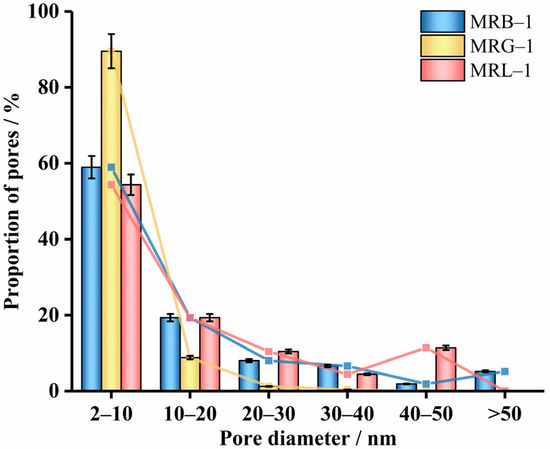To obtain accurate information about the ITZ, SEM photographs were processed using Image-ProPlus software, which quickly and accurately processed the microfracture morphological characteristics of the interfacial zone of the mortar rubble. To make the microscopic-analysis results accurate, the SEM images shown in Figure 15 were binarized. The processed image was clearly compared with the original image shown in Figure 17. This image-processing method accurately identified the microcrack segments in the SEM image. After processing, the pores in the ITZ were quantitatively analysed and spatially calibrated, a scale bar of 1 µm was created, and information was extracted about the pixel information of the pores and cracks. The pores were classified as gel pores (<10 nm), transition pores (from 10 to 100 nm), capillary pores (from 100 to 1000 nm) and large pores (>1000 nm), according to the Butte model. The pore number distributions of three groups of aggregate mortar rubble, SRB-1, SRG-1 and SRL-1, were plotted, as shown in Figure 18. According to the pore size statistics of the Butte model, the pore sizes of the mortar rubbles were concentrated in the ranges of 2–10 nm and 10–100 nm, i.e., mainly gel pores and transition pores. For granite mortar rubble, the gel pores accounted for 78% of the pores, and the transition pores were the fewest. This indicated that the macroscopic mechanical properties of granite mortar rubble were better than those of the other mortar rubbles.