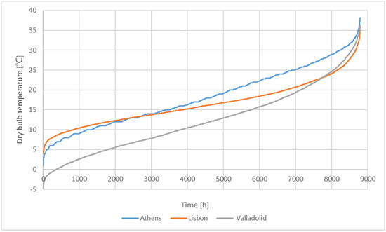 The duration curve of yearly outdoor temperatures in Athens, Lisbon and Valladolid.