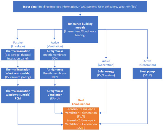 The simulated retrofit technologies were classified into three retrofit packages, including the passive package, consisting of bio-aerogel thermal insulation, PV vacuum windows and phase change material (PCM); the ventilation package, consisting of an insulating breath membrane and room-specific air handling unit with heat recovery (RAHU); and the generation package, consisting of a photovoltaic/thermal (PV/T) system and solar-assisted heat pump (SAHP). As shown in Figure 4, the packages were integrated into the reference building models and simulated separately, while the simulation of the retrofit technologies in each package followed the rule of starting from a single technology and expanding to all technologies. According to the simulated impacts of the retrofit technologies on the building energy consumption and indoor climates, the final combinations of the retrofit technologies were prepared and simulated at the building level. Finally, the primary energy consumption and CO2 emissions were calculated with the country-specific primary energy and CO2 emissions factors based on the simulated purchased energy.