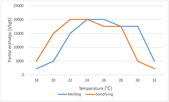 Phase change material (PCM) is a substance which releases and absorbs sufficient energy at the phase transition between solid and liquid to provide effective heating and cooling [37]. Thus, when PCM is utilized in building retrofits, it can be regarded as a passive cooling and heating method, since PCM can store/release extra indoor heat by the phase change. The PCM with a chosen phase change temperature is injected into sealed containers. The containers can be installed under the floor or ceiling in the actual installation. There are many PCM products with different phase change temperatures on the market. In this study, the PCM product S21, a salt hydrate, was chosen and treated as an independent PCM layer installed under the ceiling, further properties of which are presented in Table 5. To protect the PCM layer, it was encapsulated by aluminum plates (0.5 mm). Although the nominal melting temperature of S21 is 22 °C, the actual melting process starts at 18 °C, reaches its peak at 27 °C and ends at 36 °C [38]. Figure 5 shows the partial enthalpies during the melting and solidifying processes.
