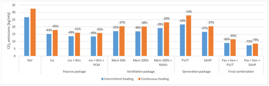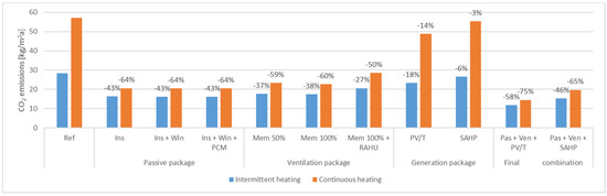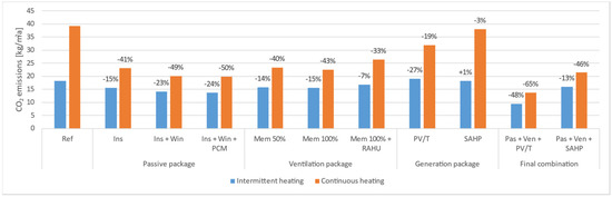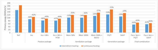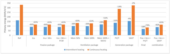 Table 18 presents the building energy consumption and CO2 emissions of the Spanish terraced house after renovation, when it was continuously heated. In terms of the passive package, the impact of the bio-aerogel thermal insulation and PV vacuum windows increased the reduction in the primary energy slightly to 42% and 7%, and to 45% and 6% for the reduction in CO2 emissions (see Figure 10 and Figure 11), while the PCM had almost no impact on the primary energy and CO2 emissions.