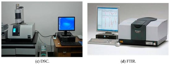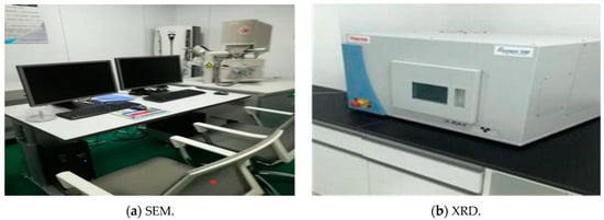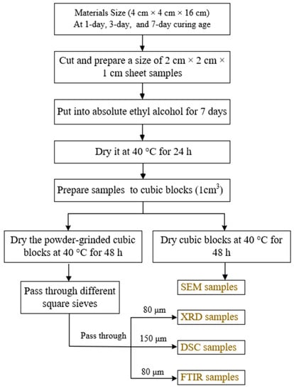 The SEM, XRD, DSC, and FTIR samples of the cement grouting materials can be prepared using the methods presented in Figure 2. Samples (4 cm × 4 cm × 16 cm) were prepared for cement grouting materials after curing age (1-day, 3-day, and 7-day). Then, the samples were further prepared into sheets (2 cm × 2 cm × 1 cm) according to the requirement. The sheet samples were soaked in absolute ethanol for 7 days and then dried for one day at 40 °C. In order to better carry out a microscopic test, the sample was finally processed into cubic blocks (1 cm3). SEM samples: the cubic blocks were dried for two days at 40 °C. The other three microscopic tests also have the following process. The above cubes were ground into powder and then dried for two days at 40 °C. The XRD, DSC, and FTIR samples were prepared by passing through 80, 150, and 80 square sieves, respectively. The corresponding equipment can be found in Figure 3.