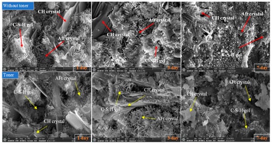 The microstructures of the cement grouting materials, with or without toner at different curing ages, are presented in Figure 4.