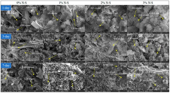 The microstructures of the CRTS with different N-S contents at the curing age of 1-day, 3-day, and 7-day are shown in Figure 5.