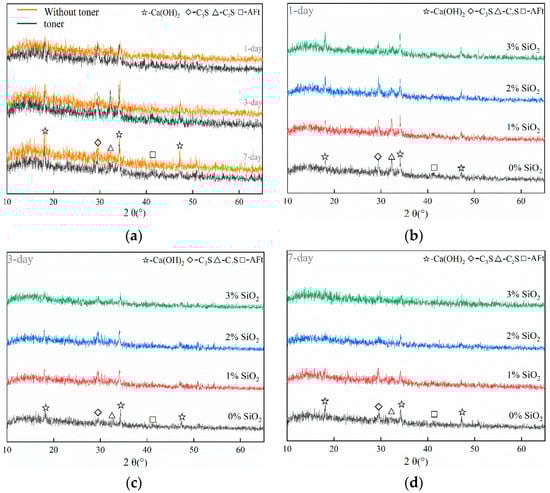 As shown in Figure 6, the XRD results of the CRTS and without toner were observed at different curing ages and with different N-S contents.