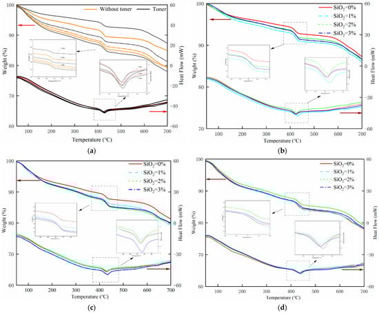 As shown in Table 5, the mass loss and enthalpy change of the CRTS have two obvious stages with different curing days and N-S contents. The N0 represents cement grouting materials without toner, and the N-S.