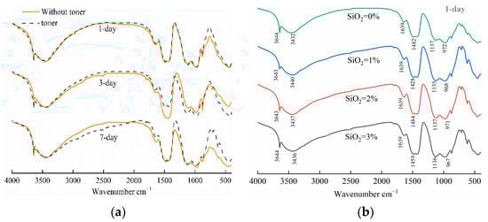 According to Figure 6a, it can be found that the CH crystal diffraction peaks of the cement grouting materials with toner are low at the 1-day curing age, and its intensity of diffraction peak at the 3-day curing age is similar to that of the cement grouting materials without toner (1-day). This is due to that the addition of toner hinders the early hydration process and weakens the early performance of the materials. Moreover, compared with the cement grouting materials without toner, the CH crystals diffraction peaks at the 3-day and 7-day curing age are higher. It shows that the addition of toner delays the conversion from CH crystals to C-H-S gels, leading to the accumulation of CH crystals and higher diffraction peak intensity of CH crystals in the XRD. The macroscopic performance shows that the compressive and flexural strength of the cement grouting material with toner is relatively low.