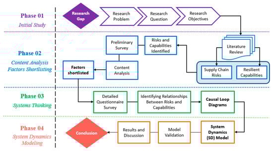 In this research, a mixed method approach was adopted. To analyze and establish interconnectivity and functionality amongst the risk factors and RCs, a qualitative approach (ST and CLDs) was used. Afterward, SD modeling and simulations were run quantitatively to assess the system’s complexity. The research process of this study comprises four main phases (Figure 2), as explained below.