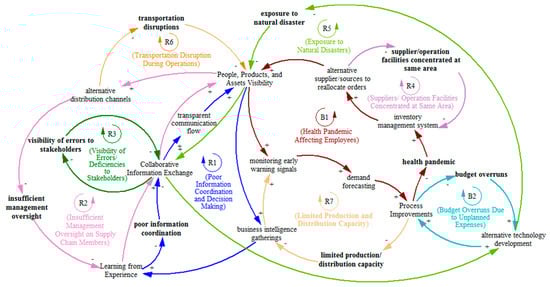 The CLD, as shown in Figure 3, is constructed based on the results collected through the surveys conducted in this research. The CLD demonstrates nine significant loops representing the interdependencies among RCs and SC risks affecting the system. It consists of two balancing (negative) loops labeled as ‘B’ and seven reinforcing (positive) loops labeled as ‘R’. Different colors in the CLD represent different loops to distinguish between them and help the readers apprehend it better. The loops are explained in the following sections.