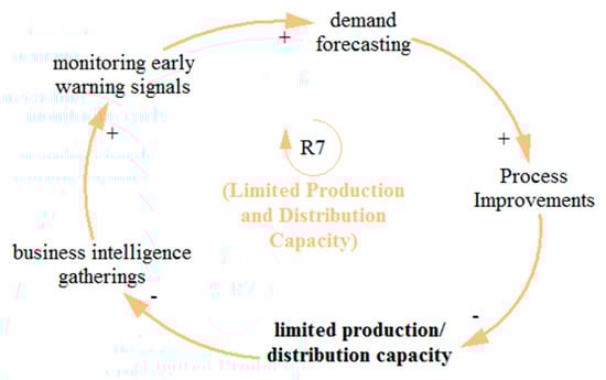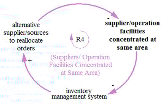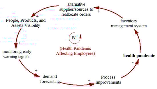 The balancing loop B1 (see Figure 4) indicates that the health pandemic affects employees and the wider SC, which disturbs the whole inventory management system. The greater the impacts of the health pandemic, the greater the disruptions in the SC, and the inventory management will decline. Poor inventory management decreases the reallocation of alternative sources and suppliers, decreasing the visibility of people, products, and assets in the SC. The decrease in visibility reduces the monitoring of early warning signals which ultimately decreases demand forecasting and can result in a failure of the SC system. With the poor demand forecasting system, there will be less attention paid to the process improvement techniques to reduce lead times and delays, which adds to the employees’ burden and worries because of the heath pandemic. On the other hand, an improved process can reduce the effects of pandemics as indicated by a negative sign; however, the impact is lower, so the overall loop is negative.