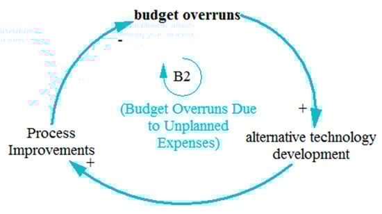 The balancing loop B2 in Figure 5 indicates that the increase in budget overruns due to unplanned expenses leads to an increase in alternative technology development by an organization to improve its system efficiency. The increase in technology development increases the process improvement techniques to reduce lead times. In addition, the increase in process improvement techniques decreases the budget overruns. Thus, an improved process and availability of alternate technologies will minimize the budget overruns.