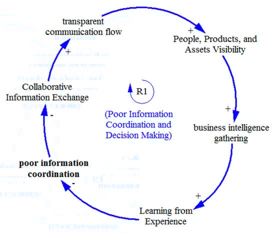 The reinforcing loop R1 in Figure 6 shows that poor information coordination and decision making is caused by the decrease in collaborative information exchange among stakeholders. This decrease in information exchange reduces the transparent communication flow of an organization, both externally and internally. The transparent communication flow decreases the visibility of people, products, and assets and decreases awareness of future trends and practices collected through business intelligence gatherings. Further, business intelligence can be gained through experience, thus decreasing poor information coordination and decision making.