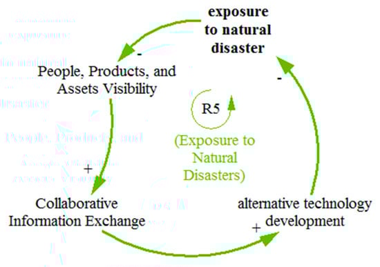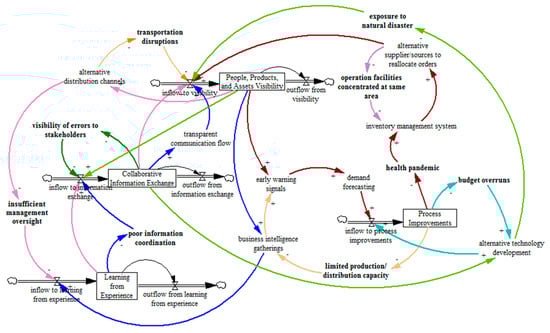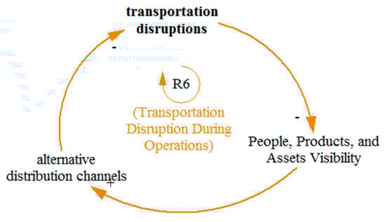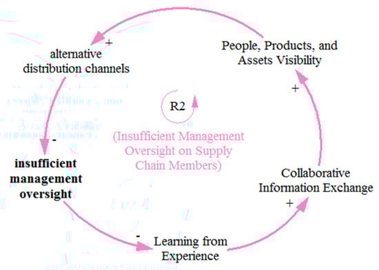 The reinforcing loop R2 in Figure 7 indicates that insufficient management oversight of SC members is because of low learning from experience by an organization. Decreased learning from experience decreases the collaborative information exchange among stakeholders, decreasing the visibility of people, products, and assets on site. This reduced visibility reduces the chance for alternate distribution channels and modes of transport during any disruption. The availability of alternate distribution channels and modes of transport improves management oversight.