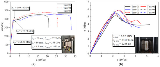 The material properties were obtained by tensile tests conforming to Chinese Standard GB/T 228.1–2010 [24]. Table 2 and Figure 2a summarize the material properties of the steel. The properties of PG were studied according to Chinese Standard GB/T 50081-2019 [25]. Table 3 and Figure 2b summarize the measured material properties of the PG. The material properties of the sheathings were determined according to Chinese Standard GB/T17657-1999) [26]. The results are presented in Table 4.