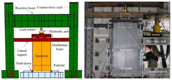 Before the formal test, the specimen was placed on the pedestal, and the bottom of the specimen was fixed to the pedestal using fasteners. On the left and right sides of the specimen, two hold-downs were also used to fix the specimen. Then, a distribution beam was arranged on the top of the specimen. Subsequently, a jack and a load sensor were arranged between the distribution beam and the reaction beam. Lateral supports were located on both sides of the distribution beam to prevent out-of-plane deformations of the specimens during the tests. The test setup is shown in Figure 3. According to the previous finite element analysis, the ultimate bearing capacity of each specimen was estimated. Before the formal test, the specimen should be preloaded to eliminate the gap between the testing machine and the specimen. The applied load was approximately 10% of the predicted value. After unloading the preloaded loads, the axial compression tests were officially started. The loading value of each loading step was 10 kN, and each loading step lasted for 1 min. When the applied load approached the predicted peak load, the load applied in each loading step was changed to 5 kN. When the applied load was reduced to 85% of the peak load or the specimen could not continue to bear the applied load, the testing machine would be turned off, and the test would be ended.
