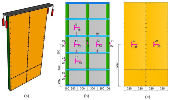 Arrangement of measuring instruments. (a) Locations of LVDTs; (b) locations of the studs and PG gauges; (c) locations of sheathing gauges.