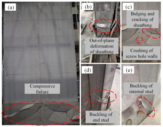 In the initial stage of loading (from 0 kN to 100 kN), no obvious damage phenomenon was observed. With the increase in the applied vertical load, a compressive tendency was presented at the seams of the wall sheathings, accompanied by slight noises. When the applied load reached 110 kN, the first diagonal crack appeared at the seam of the wall sheathing. When the load reached 140 kN, a slight local buckling on the stud surface was observed, which was located approximately 150 mm from the bottom of the wall. Moreover, cracks at the wall sheathing seams kept propagating with the increase in the applied load, and some new cracks were observed on the wall sheathings at the bottom of the wall. When the load reached the peak load of the specimen, the bottom wall sheathing fell off in blocks and was accompanied by sharp noises. The failure characteristics of the wall after the test are shown in Figure 5. The bulging deformation of the end stud was approximately 20 mm and a huge out-of-plane deformation of the wall sheathing was observed, as shown in Figure 5b. Serious bulging and cracking at the bottom of the wall sheathings and the crushing of screw hole walls at the seams were presented, as shown in Figure 5c. After removing the sheathings, the significant buckling phenomena of the end and internal studs were observed, as illustrated in Figure 5d,e.