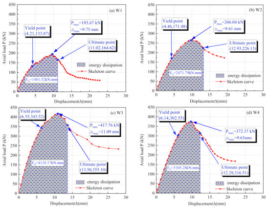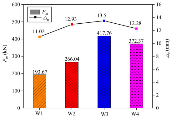 The peak load and ultimate displacement of each specimen are presented in Figure 10. Compared with specimen W1, the peak load and ultimate displacement of specimen W2 are improved by 37.4% and 17.3%, respectively. The reason for those changes is that filling PG in the studs increased the buckling stability of the steel tube studs and improved the axial bearing capacity of the studs. Moreover, the infill PG can also contribute to the axial bearing capacity of the specimen. Compared with specimen W2, the peak load and ultimate displacement of specimen W3 are increased by 57% and 4.4%, respectively, indicating that filling PG between the studs can significantly improve the axial bearing capacity of the wall, but it has a slight impact on the deformation capacity of the wall. The reasons are as follows: the PG filled between the studs shared part of the vertical load, which leads to the increase in the bearing capacity. Owing to the filling effect of the PG in the studs, the PG filled between the studs has little effect on the buckling performance of the studs. Hence, the deformation capacity of the specimen will not be significantly improved. Compared with specimen W4, the peak load and ultimate displacement of specimen W3 are increased by 12.2% and 9.9%, respectively. This proves that the wall sheathing has a beneficial effect on the bearing capacity and the deformation ability of the wall. In essence, those improvements are due to the constraint effect of the wall sheathing.