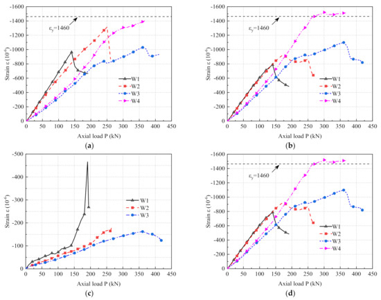 The longitudinal strains of the middle and bottom sections of the end studs are shown in Figure 11a,b, which were obtained from strain gauges 19 and 23, respectively. It can be seen from the figures that the strain curves of specimen W1 dropped rapidly as the specimen entered the yield state, and the strain values of specimen W1 are significantly lower than those of other specimens. This is because the studs of specimen W1 are composed of hollow steel tubes only, the strength of the steel tube is not fully developed due to the buckling distortion of the studs. For specimens W2 and W3, the comparison of the strain curves showed that the strain values of specimen W3 are much higher than those of specimen W2, indicating that the constraint effect of the infill PG between the studs is more beneficial to developing the strength of the steel tubes. The strain values of specimen W3 are also higher than those of specimen W4. It proved that the wall sheathing provided an effective lateral restraint for the CFS frame, which lead to an increase in the axial bearing capacity of the wall.