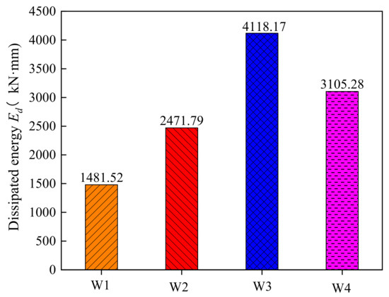 The energy dissipation capacity can be used to evaluate the axial compression performance of specimens. To quantify the energy dissipation capacity of each specimen, the area enclosed by the load-displacement curve before failure and the horizontal axis can be defined as the dissipated energy of specimens, as shown in Figure 9. After careful calculation, the dissipated energy Ed of all specimens is illustrated in Figure 12. It can be seen from the comparisons that the dissipated energy of specimen W1 is the lowest by comparison with those of other specimens. This is because of the buckling distortion failure of studs, which led to a low-stress level of the steel tubes and reduced the energy dissipation capacity of the specimen. The dissipated energy of specimens W2 and W3 are 2471.79 and 4118.17 kN·mm, respectively, which are 66.8% and 177.9% higher than that of specimen W1. This indicates that filling PG in and between the studs can improve the energy dissipation capacity of CFS walls. In essence, the improvement of the energy dissipation capacity benefits from the load-bearing contribution of PG and the delay of the buckling failure of the steel tube studs. The dissipated energy of specimen W3 is 32.6% higher than that of specimen W4, indicating that the wall sheathing has a certain restraint effect on the CFS frame as well as the infill PG, which can effectively improve the energy dissipation capacity of the specimen.