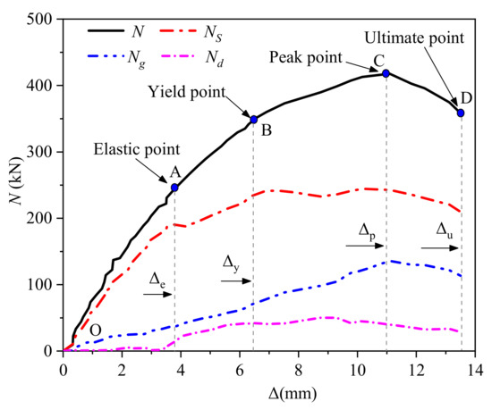 Segment OA: In this segment, the variations of the internal forces are almost linear, which indicates that the specimen is in an elastic state. Steel tubes shared the most vertical load, followed by PG between the studs and PG in the tubes, the reason is that the vertical load was assigned according to the elastic modulus of materials, while the elastic modulus of steel is much higher than that of PG. When the loading approached point A, obvious turnings were observed on the curves labeled as Ns and Nd. The vertical load borne by PG in the steel tubes increased rapidly, while the vertical load borne by the steel tubes decreased a little, this is caused by the buckling of the steel tubes.