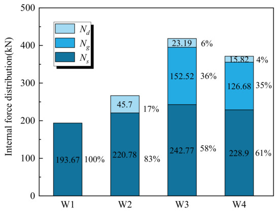 During the loading process of specimen W3, the development of the internal force of different components is shown in Figure 13. The proportion of the internal force at key loading points is shown in Figure 14. It can be found from the figures that the variations of the internal forces can be divided into four segments, as described below.