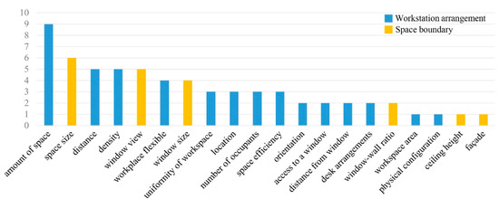 For the extraction of office layout factors in the existing works of literature, all the office layout-related words were sought out from the abstract section of the selected research and review articles. The initially collected words were subsequently reorganized to make them easy to understand. Office types were excluded from the word cloud when considering their multi-factor combination feature. This study finally summarized 20 words covering all the office layout characteristics in the literature abstracts. Among them, 14 words belonged to the workstation arrangement category, and 6 words belonged to the space boundary category. The frequency of word occurrence in the pieces of literature is shown in Figure 2.