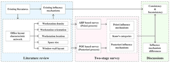 This study conducted a multi-perspective investigation focusing on the influences of office layout factors on occupant satisfaction. Existing pieces of literature are deconstructed and reorganized to establish an office layout characteristic network. The existing findings for the influence mechanisms are summarized by following five office layout factors in the network as a clue. For a comparative investigation of the office layout factors, two surveys from priori and posteriori perspectives were conducted in China’s Yangtze River Delta region. The online questionnaire survey was conducted based on the AHP method to evaluate and compare factor importance weights. The field survey was conducted based on the POE process to investigate the detailed influence mechanisms of office layout factors in academic buildings by introducing the Kano model. Finally, the influence mechanism differences between the priori and posteriori processes were extracted, and a discussion of consistency and inconsistency regarding the existing works of literature on factor influence mechanisms was drawn.