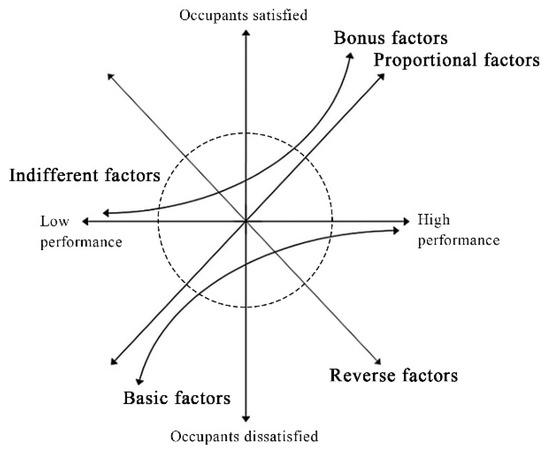 The Kano model was introduced to analyze the influence mechanisms in positive and negative attitudes independently. Noriaki Kano proposed the Kano model in the 1980s [76], which has been applied as an efficient evaluation method in recent research on generalized IEQ factors [63,77,78]. The Kano model classifies the product qualities into five categories, as shown in Figure 4. (1) Basic factors: These can be thought of as the minimum requirements. (2) Bonus factors: The impact on overall satisfaction, resulting from the positive performance being greater than that resulting from the negative performance. (3) Proportional factors: The occupant’s satisfaction level changes proportionally according to the performance of these factors. (4) Indifferent factors: Factors do not result in either satisfaction or dissatisfaction. (5) Reverse factors: A high degree of achievement resulting in dissatisfaction.