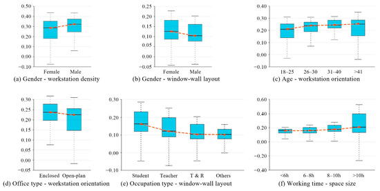In terms of the space boundary factors, the importance of space size increases slowly with the daily working hours (Figure 5f). An appropriate space size has a potential positive influence on an occupant’s satisfaction. The longer employees stay in the office environment, the more obvious it is to perceive this impact. The window-wall layout importance showed a significant difference for gender, showing that the importance of window-wall layout is higher among females (Figure 5b). Moreover, the most significant difference in window-wall layout appears in the comparison of academic occupations (students and teachers) with technical occupations (technique and research and other staff). Students and teachers generally believe a window-wall layout to be more important (Figure 5e). We found the reason for this trend in the POE-survey stage; that is, the workplaces on campus always have poor daylighting and poor interior shading control. Teachers and students are eager to have a better natural lighting environment, resulting in higher importance weights of the window-wall layout.