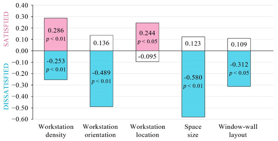 Regression coefficients of office layout factors on overall satisfaction. The values attached to each bar represent regression coefficients for each office layout factor’s satisfied occupants (pink bar) and dissatisfied occupants (blue bar).