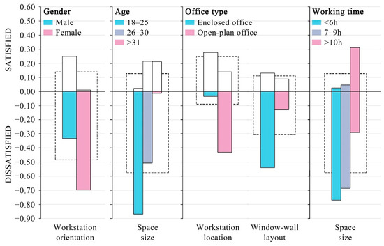 In terms of the workstation arrangement factors, workstation orientation was previously defined as a basic factor, but in the male group, negative effects decreased, and positive effects increased, resulting in a proportional factor. Correspondingly, unfavorable workstation orientation always led to a huge decrease in satisfaction in the female group. On the other hand, the influence of workstation location experienced a great change in the open-plan office group. People dissatisfied with their workstation location may lead to a significant decrease in overall satisfaction when working in an open-plan office, which leads to the workstation location being a basic factor. The overall impact of the workstation’s location is also greater in open-plan offices.