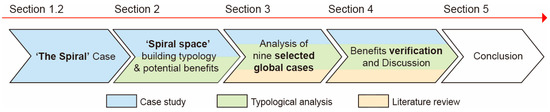 Discovering the core pattern of existing cases is the foundation to foster reasonable innovations [38]. This study treats The Spiral as a case of the ‘spiral space’ building typology proposed in this study. Refer to Section 3.10 for more details. This practice-led research investigates more typical global cases based on fieldwork (Section 3), to answer the following two research questions: