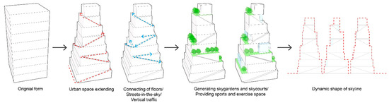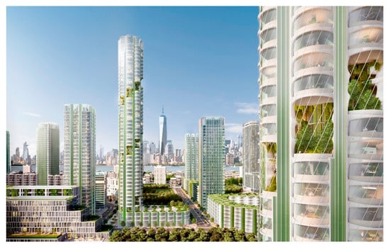 Meanwhile, The Spiral aims to work as an integrated part of the urban green and blue system (Figure 1) to enhance the network of the urban green space [35] and support the iconic skyline of New York City [36]. As shown in Figure 1, the chain of sky gardens is the key component of ‘The Spiral’ proposal to ‘vertically balance open-space to built-up area ratios within the tall buildings’ [27]. Sky garden generally refers to ‘planted landscapes built above the ground: in intermediate floors of buildings or at the rooftop’ [37]. It is different from the single-roof sky garden (or disconnected and randomly distributed ones) designed in common buildings. It is not hard to find that the benefit of this typology enhances the occupants’ accessibility to public green space, no matter which floor they stay on. In this regard, ‘The Spiral’ has proposed a building-design solution to produce incremental public open and green spaces in high-density urban areas. Moreover, the vertically connected sky gardens, decorating the iconic city skyline, further strengthen the social interactions between dwellers by breaking the isolation between floors.