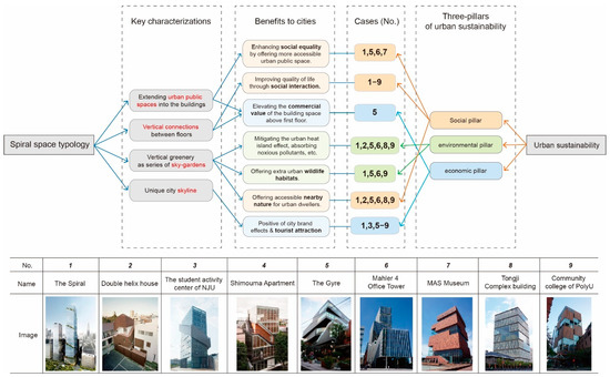 As illustrated in Section 1.2, the ‘spiral space’ (Figure 1) is not hard to observe, which refers to the characteristics of the spiral-space building typology. The key potential contributions of thespiral-space typology to cities are presented in Figure 3, which are as follows: (1) extending urban public spaces into the buildings and broadening available public spaces in cities, (2) connecting adjacent floors vertically to enhance social interactions, (3) generating a series of sky gardens to closely imitate the natural working/living environment, and (4) creating attractive and architectural forms and skylines for cities. Additionally, as presented in Figure 4, this building typology is promising for supporting urban sustainability in the three pillars (i.e., social, environmental, and economic) [40], based on qualitative analysis. The details of urban sustainability are clarified in the subsequent section. To be specific, this building typology could enhance public space accessibility and social interaction (social), mitigate the urban heat island effect (environmental), and impose a positive city brand effect (economic). The cases selected in Figure 4 are introduced in Section 3, and the potential benefits proposed here are qualitatively verified in Section 4.1 based on the field observation of the selected global typical cases.