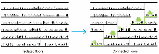 The research has suggested that planning and designing public interactive spaces can enhance social connections [59,60]. As shown in Figure 3, another key feature of the ‘spiral-space’ typology is the vertical connections of different heights. The vertical connections contribute to breaking insolation between floors and interconnecting adjacent floors. As visualized in Figure 9, The Spiral, designed by BIG, explores the potential of connecting multiple levels by inserting spiral sky gardens (space) to encourage interactions among the occupants [35]. As presented in Figure 9, The Spiral not only breaks the isolated stories, but also offers helpful connections to sky gardens for the occupants on different floors. Collaborating with sky gardens, the vertical traffic path, generated by the spiral space also contributes to a healthy lifestyle for inhabitants by encouraging physical activities and providing streets-in-the-sky as exercise (or sport) yards. As an additional alternative to the vertical-traffic approach, it can also serve as open-air fire stairs as a fair-weather alternative to elevators with fresh air and the open view to the surrounding scenery, such as in the cases of the Shimouma apartment and the Mahler 4 office tower (Figure 8), or enclosed (fire) stairs in the Double Helix House and NJU student activity center (Figure 10). For commercial buildings, the spiral space also supports the engagement of more customers with the second floor and above, increasing the commercial value of floors above the first floor (e.g., third floor and above) by enhancing their (direct) accessibility from the ground. For example, in The Grey designed by MVRDV, two vertical-stepped terraced streets, generated by spiral space, strengthened equal accessibility to all floors (Figure 11). The spiral space applied in The Grey ‘produces a highly iconic and sculptural figure and attracts and invites people, not only at the street level, but also towards destinations higher up’ [61], and ‘explores its various levels and terraces, and the shops within’ [62], as illustrated in Figure 11.