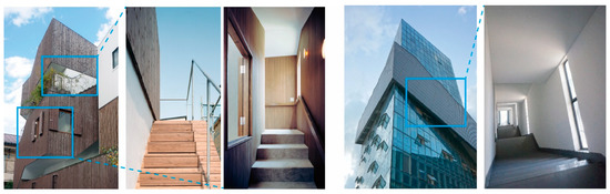 The stairs in spiral space of two cases; Double Helix House (left) and NJU student activity center (right) (the second and third images from [63]).