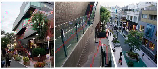 The seven-floor shopping center ‘The Gyre’, the work of MVRDV, is located in Omotesando, Tokyo. The architectural form of ‘The Gyre’ is generated by rotating floors at different angles around the central axis. A series of terraces emerge and are subsequently connected by stairs. Finally, two pairs of spiral spaces—two vertical-stepped terraced streets—were created and carved into the diagonal periphery of the building. A couple of the spiral vertical streets in opposite directions (one street ascending and the other descending) are connected to each other at the top floor of the building, which functions as two vertical-stepped terraced streets for the shopping center, and guides more customers to commercial space above the ground floor (Table 1). The spiral space, coiled on the building, not only offers equal access to all floors, but also produces an iconic and sculptural form of ‘The Gyre’.