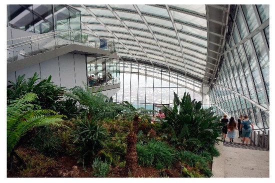 The sky-gardens have become an extended urban space vocabulary and could solve the problem of insufficient communal spaces in densely populated cities by offering an ‘external environment’ indoors [27]. Treating sky gardens in buildings as ‘public space’ is deemed a promising new urban planning and design strategy [64], for example, the following cases have been discussed: Walkie Talkie Tower, London, UK [64,65] (Figure 12), and Pinnacle@Duxton and SkyVille@Dason, Singapore [27,66,67] (Figure 13 and Figure 14).