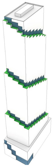 The 21-floor Teaching and Research Complex Building, designed by Jean-Paul Viguier, is located in Tongji University, Shanghai, China. This building comprises seven stacked three-floor L-shaped functional components of the same size. Each component rotates 90 degrees clockwise from the lower one, except the bottom-most one. Stacking and rotating six times, a central atrium accompanied by spiral space is formed (Table 1). Several conference halls, media centers, and public sky gardens are distributed in the spiral space [55].