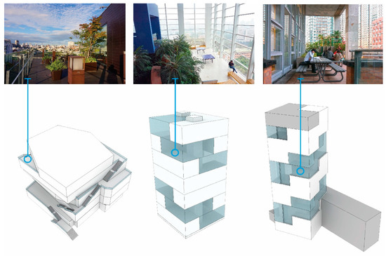 Unlike the cases mentioned above, which require elevators to reach the public sky gardens, the spiral-space building typology allows the extension and integration of urban space into buildings via embedded spiral paths, ultimately creating more accessible public space for citizens. Meanwhile, the spiral space itself could also serve as a chain of sky gardens [35], such as ‘The Spiral’ case (Figure 1). As presented in Figure 15, a chain of sky gardens could be naturally generated by this building typology, and this potential has also been reached in most cases (Table 1). Figure 16 illustrates the chain of series sky gardens distributed in The Grey, Tongji Teaching–Research Complex building, and Community College of PolyU. Sky gardens offer a more informal gathering area for meetings, events, and recreational activities, and encourage people to stay for longer periods of time within buildings. The sky gardens’ integration increases greenery coverage and contributes to recreating a balance between open space and built areas, ultimately enhancing the overall occupancy satisfaction of buildings [27,68].